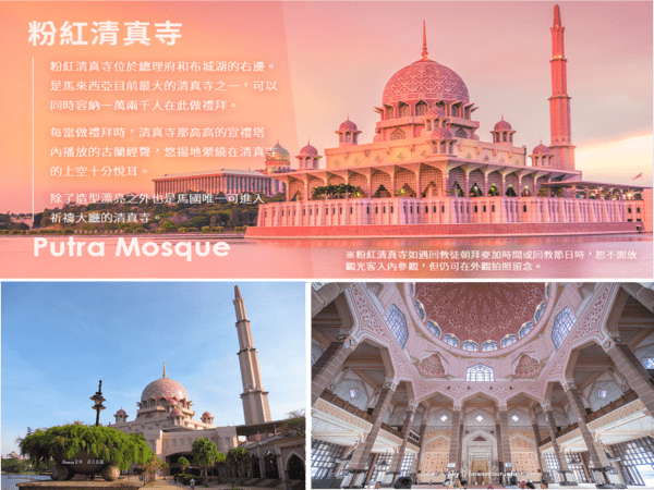 【上粉紅清真】位於總理府旁。廣場側面是水上清真寺的全貌。這座四分之三建於湖面上的水上清真寺是馬來西亞目前最大的清真寺之一,可以同時容納一萬兩千人在此做禮拜。每當做禮拜時,清真寺那高高的宣禮塔內播放的古蘭經聲悠颺地縈繞在清真寺的上空十分悅耳。除造型漂亮之外也是馬國唯一可進祈禱大廳參觀的清真寺。遇回教徒朝拜麥加時間或回教節日時,恕不開放觀光客入內參觀,但仍可在外觀拍照留念。