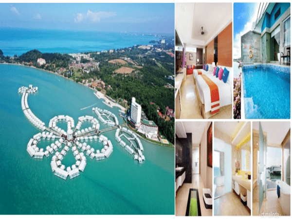 【大紅花海上渡假村】位於麻六甲峽最南端的長沙灣,是唯一擁有珊瑚礁的海灣,渡假村座落於波特森海域,從空中俯看就像是一朵馬來西亞國花~大紅花(朱槿花),安排入住獨具特色的海上泳池 VILLA,房間擁有24坪舒適寬敞空間,兩張KING size1的大床及全新衛浴設施,另外還有獨立陽台及蒸氣室和私人泳池,寧靜舒適的環境更是享譽全馬。